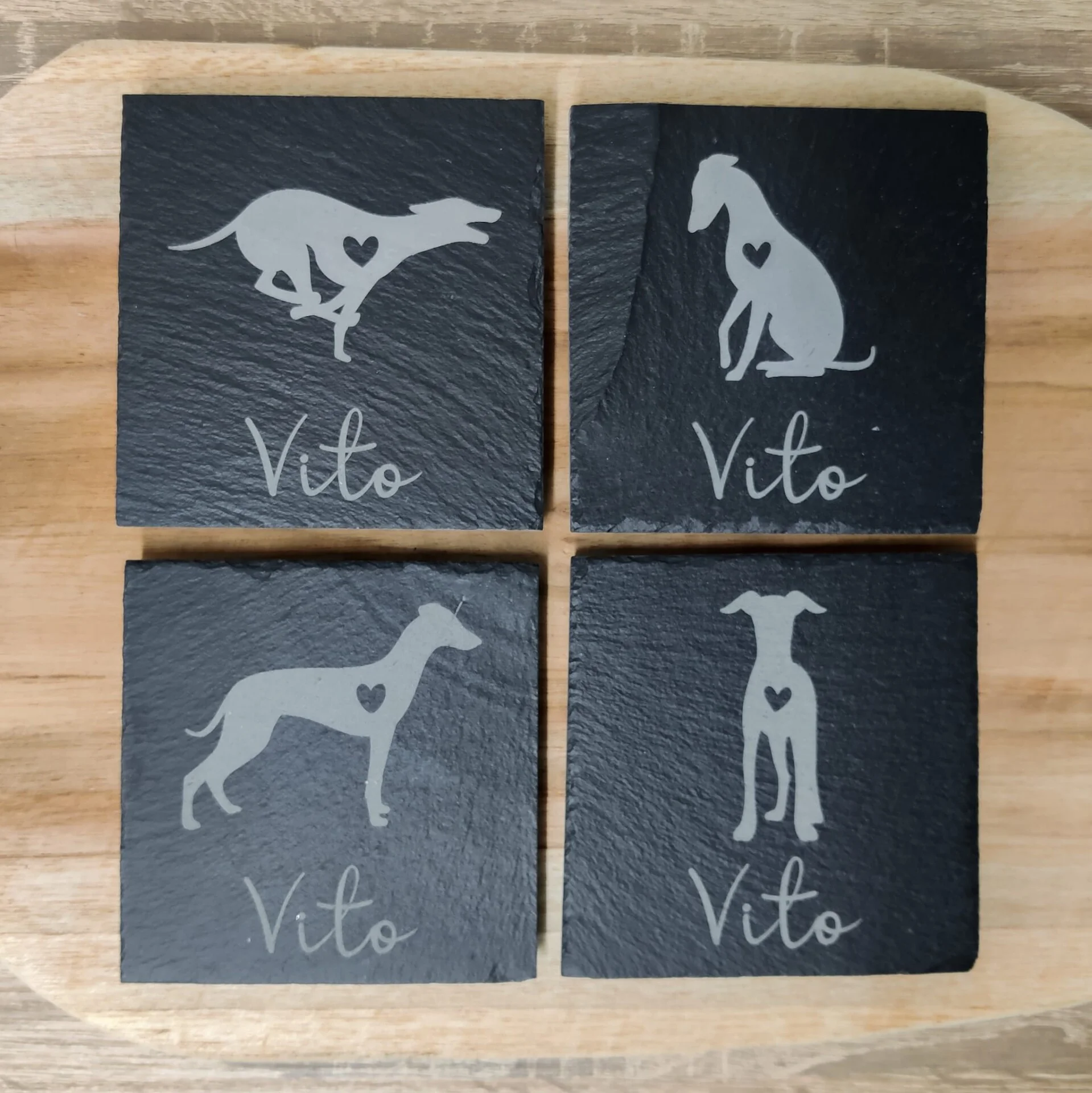 Ontdek unieke leisteen onderzetters met whippet of Italiaanse windhond, perfect voor elke hondenliefhebber. Personaliseer met een naam voor een speciaal cadeau.